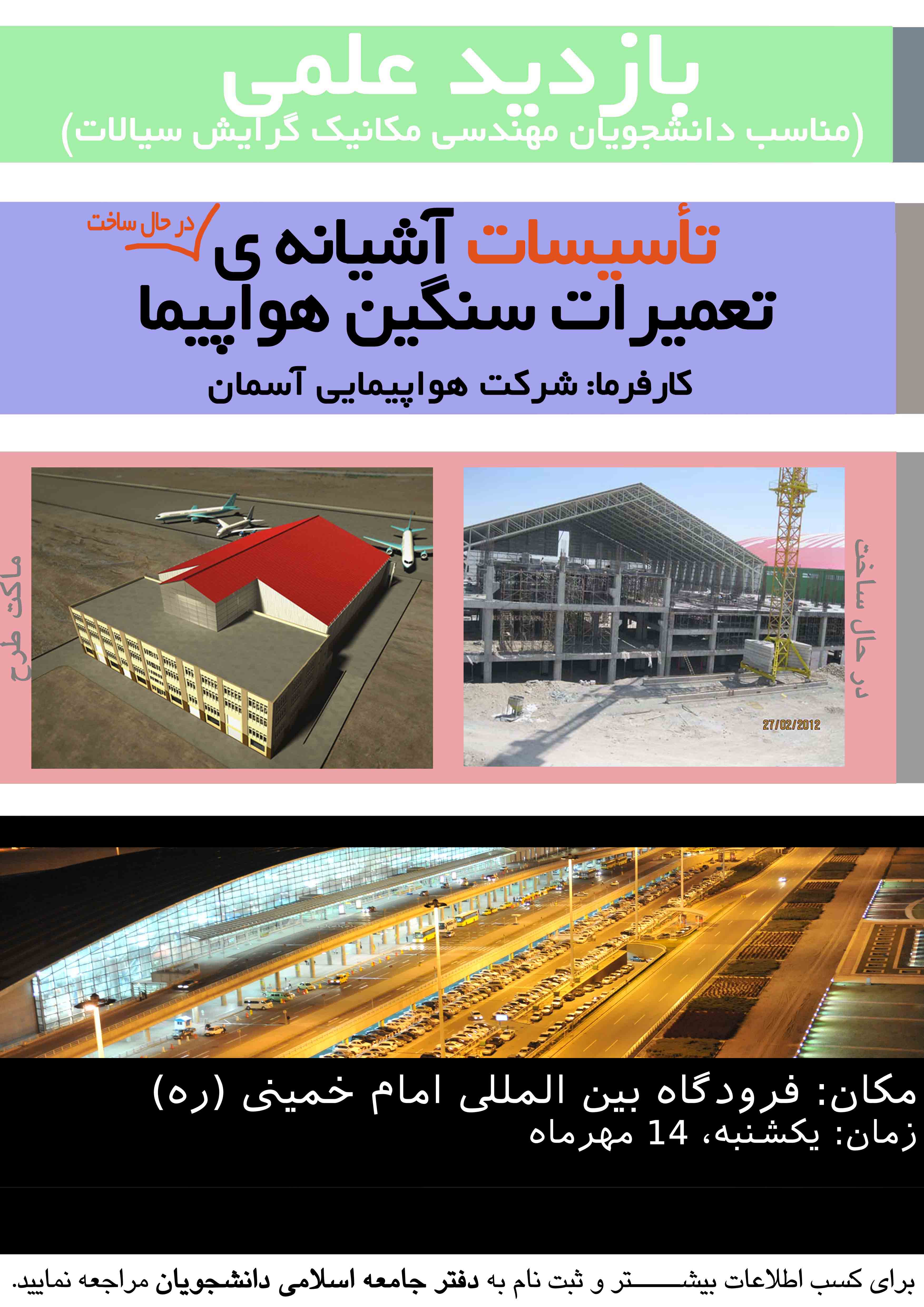 برنامه ی بازدید علمی دانشجویان رشته ی مهندسی مکانیک از تاسیسات آشیانه ی در حال ساخت هواپیما واقع در فرودگاه بین المللی امام خمینی (ره) طبق برنامه در روز یکشنبه انجام شد؛ خوشبختانه دانشجویان از این برنامه رضایت نسبی داشتند.